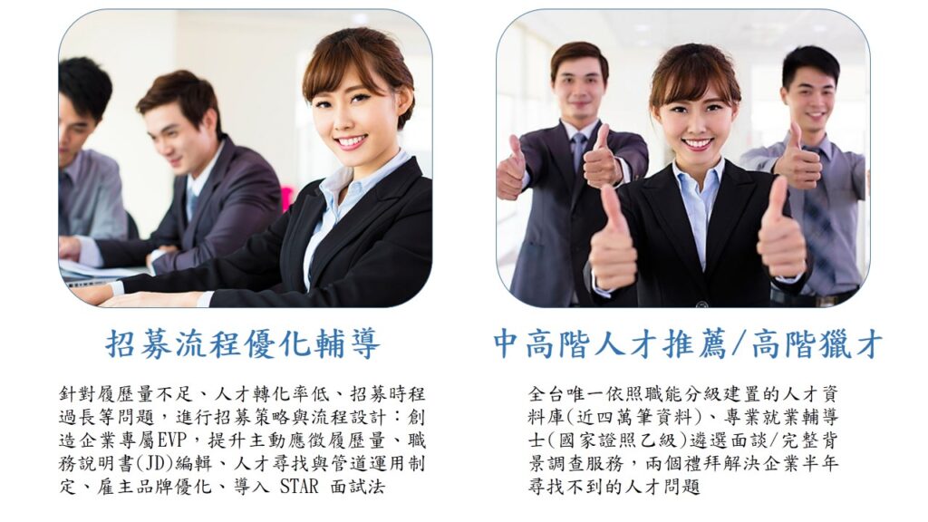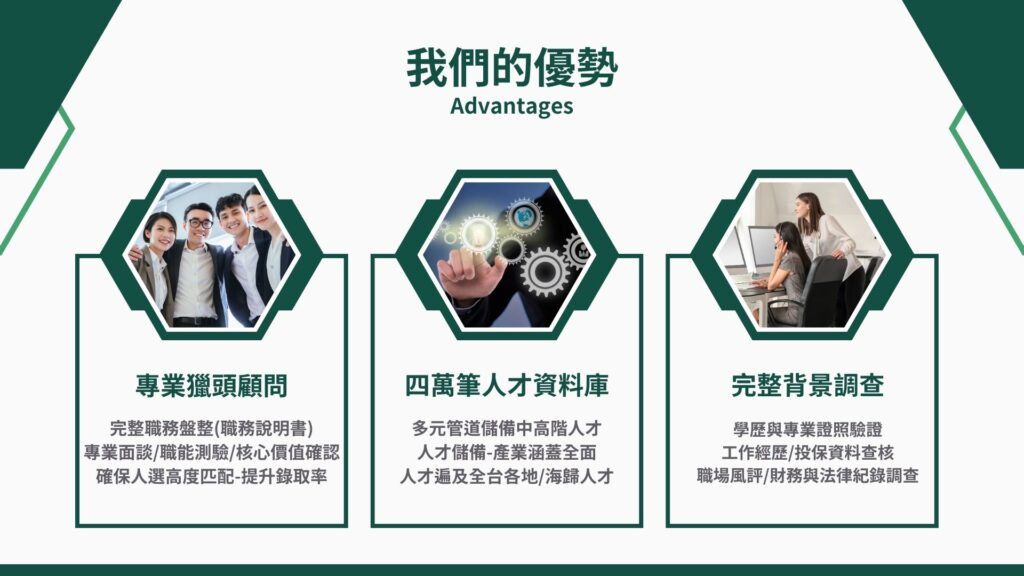 職缺刊登後履歷太少?關鍵人才總是找不到?別擔心,16 年資深獵頭顧問團隊+4萬筆人才資料庫,為您全面優化招募管道,精準推薦人才!兩個禮拜解決您半年找不到人才的痛苦,讓頂尖人才主動加入您的團隊!